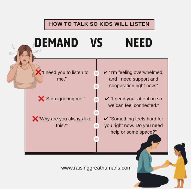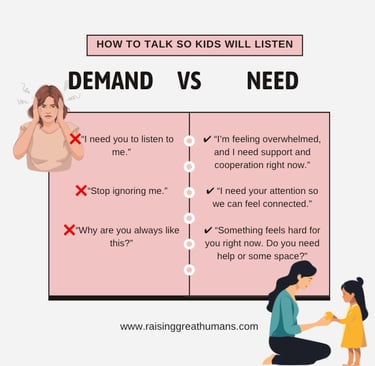 When children hear needs instead of demands, they learn how to express themselves with clarity, respect, and confidence.