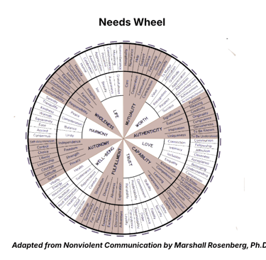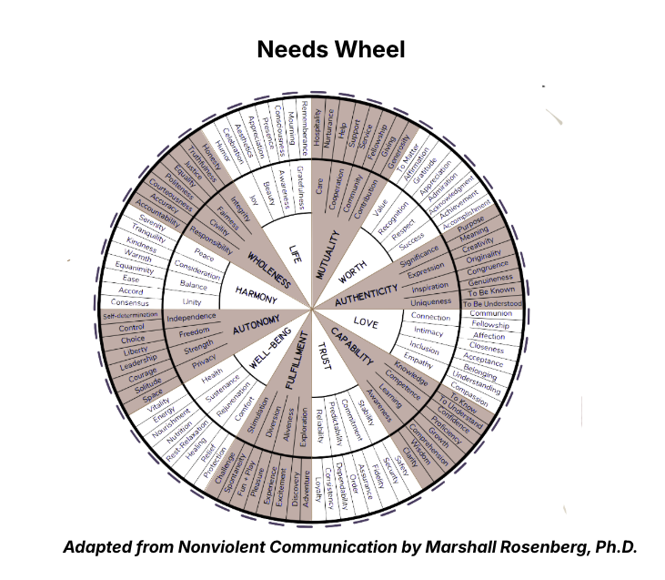 Through Nonviolent Communication (Marshall Rosenberg, PhD) and the wheel of Needs below, I learned a simple but powerful shift:
